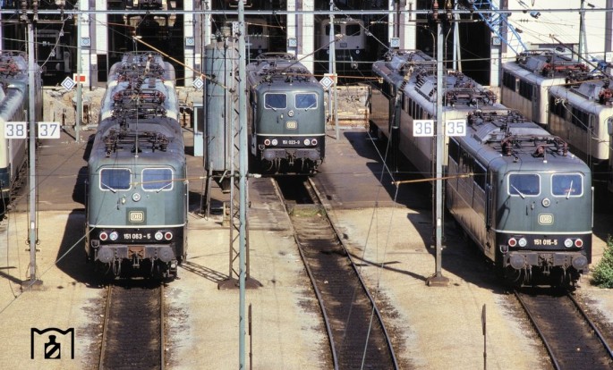 Die 151 054-4 ist 1981 mit ihrem Güterzug im Altmühltal unterwegs. Copyright: Peter Schiffer/ Slg. Eisenbahnstiftung
