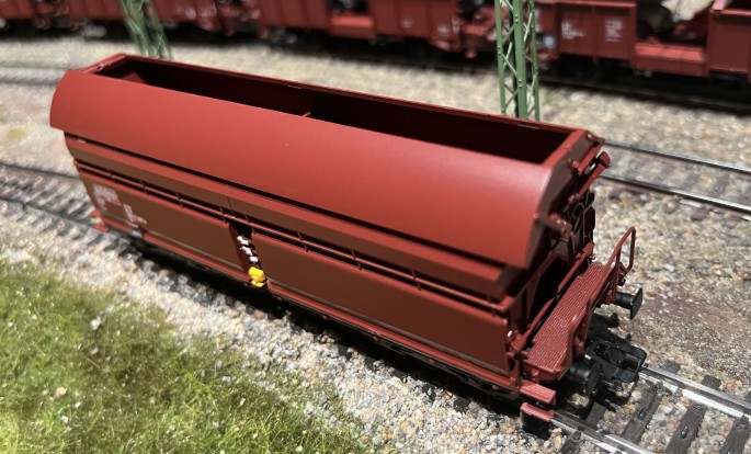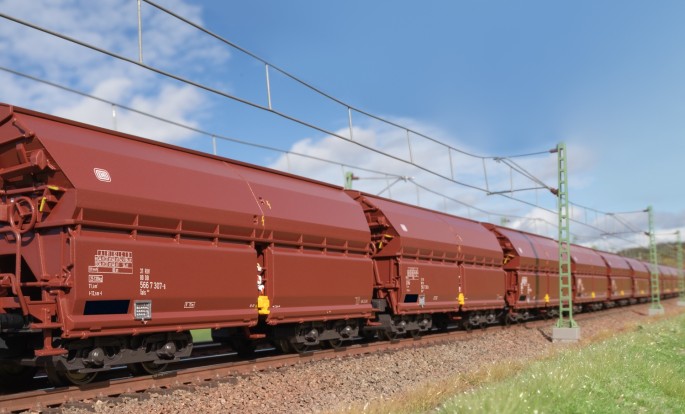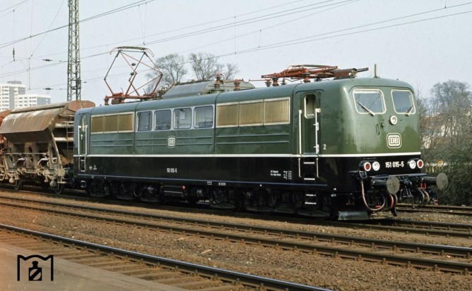 Die neue 151 zieht einen langen Ganzzug aus Schwenkdachwagen