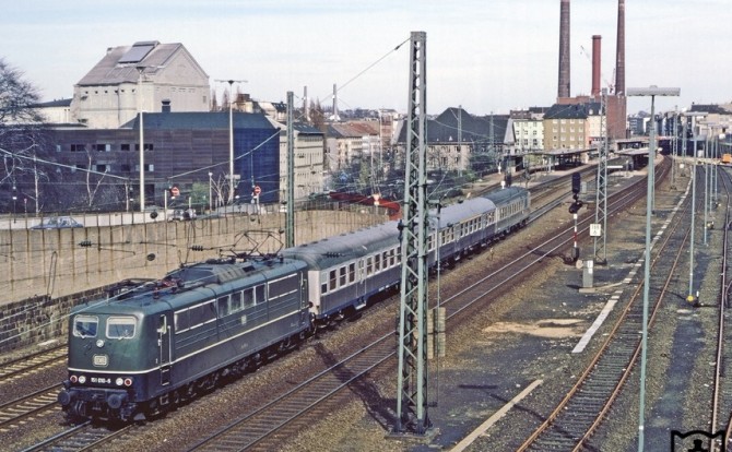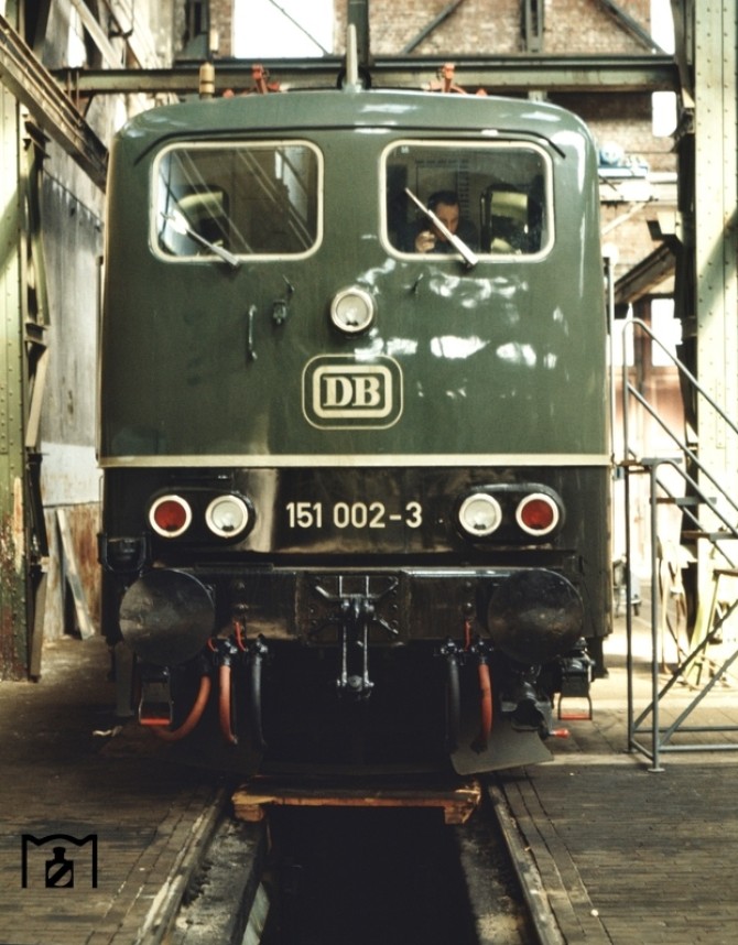 Die 151 019-7 aus Hagen-Eckesey zieht 1986 einen Ganzzug aus Tals968 durch den Bahnhof Finnentrop. Copyright: Joachim Bügel / Slg. Eisenbahnstiftung
