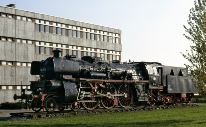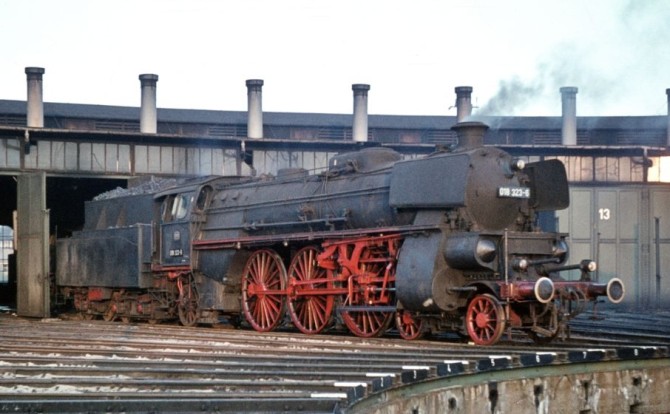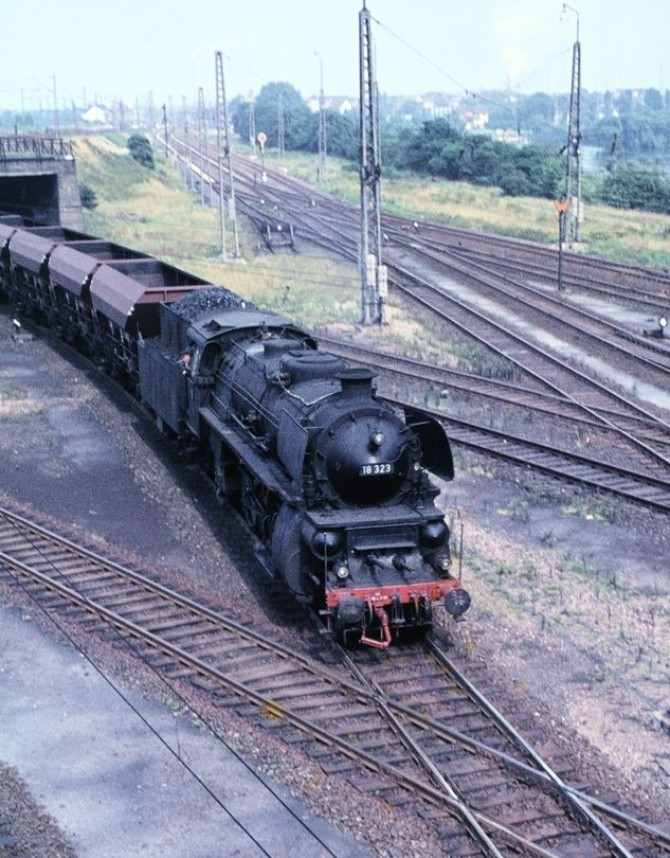 Bei einer Sonderfahrt im Jahr 1966 wurde die 18 323 im Hannover restauriert. Extra für diese Sonderfahrt wurden ihr Kesselringe und Altbaulaternen "spendiert". Copyright: Gerhard Moll / Slg. Eisenbahnstiftung