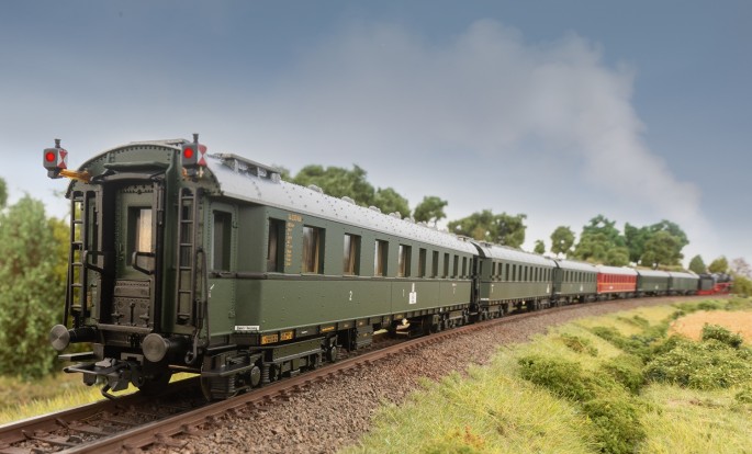 Das neue H0-Modell vor seinem Schnellzug mit den ebenfalls neuen Wagen der Einheitsbauart 1928 bis 1930