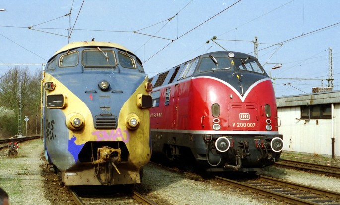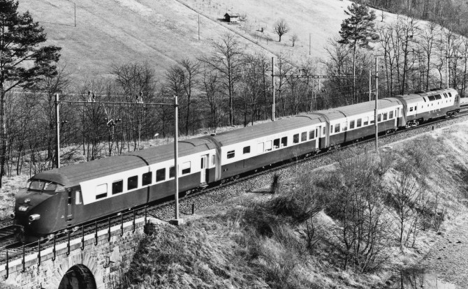 Einträchtig nebeneinander - die beiden Züge RAm 502 und NS 1002 zeigen die Unterschiede von TEE zum ONR sehr gut. copyright: Werksfoto SIG/Neuhaussen
